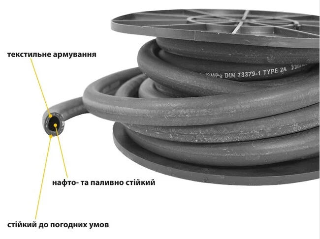 • Середній шар — текстильна арматура. Підвищує загальну міцність паливного шлангу та надійність роботи під тиском.