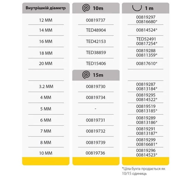 Паливні шланги TEDGUM доступні у відрізках по 1 метру, а також рулонах 10 або 15 метрів. Асортимент включає 12 внутрішніх діаметрів — від 3,2 до 20 мм. Талиця артикулів: