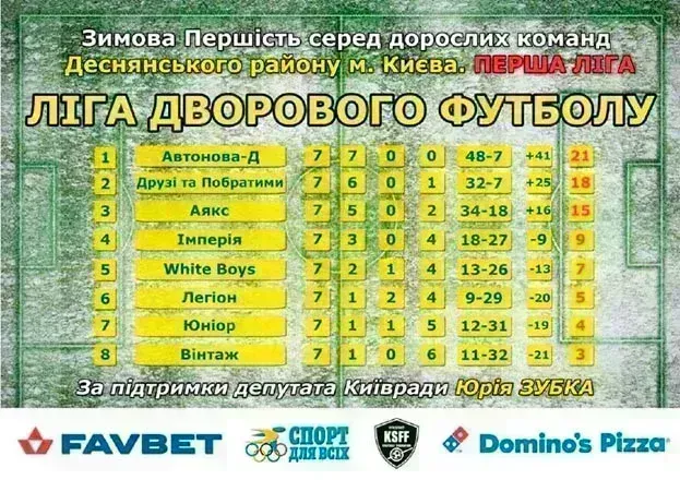 У Деснянському районі столиці, де грала команда «АвтоНова-Д», у першій лізі «зимової першості» грало 8 команд. Протягом всього турніру було проведено 56 ігор.