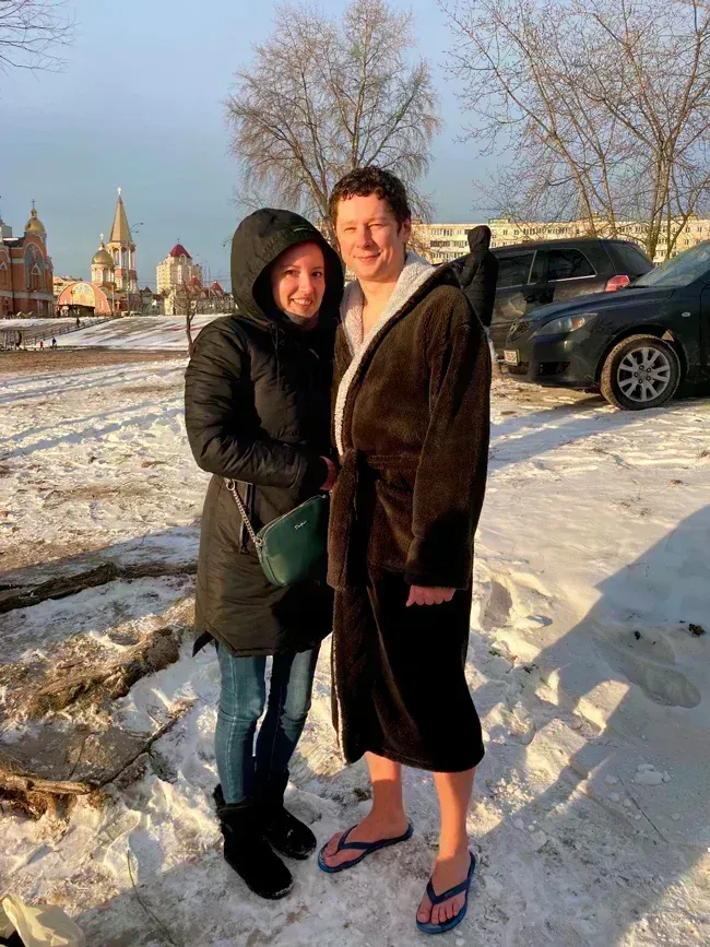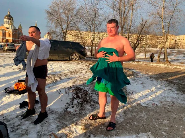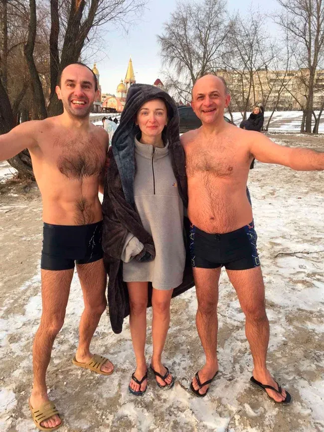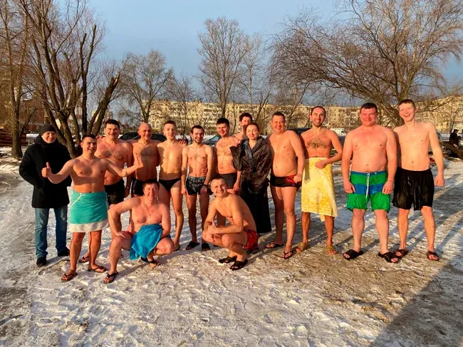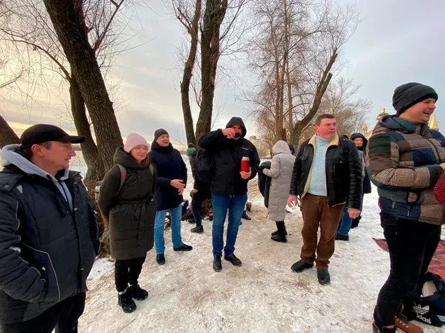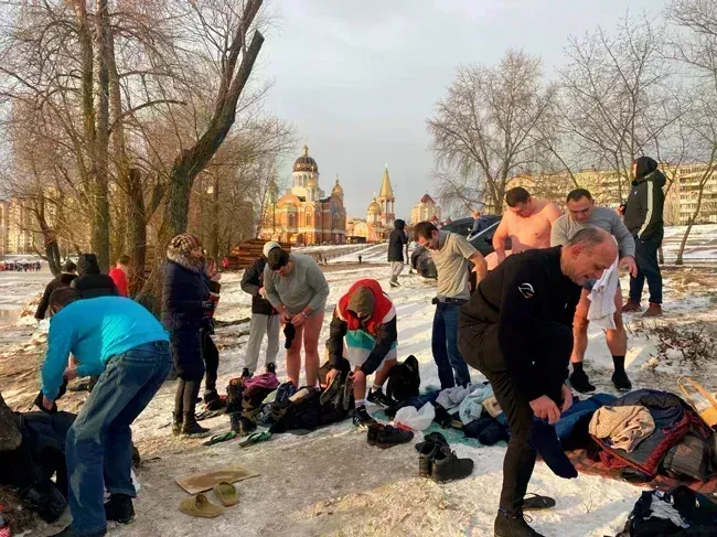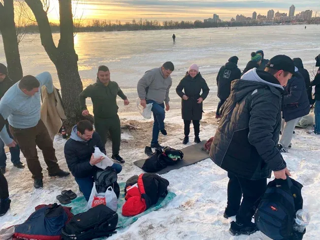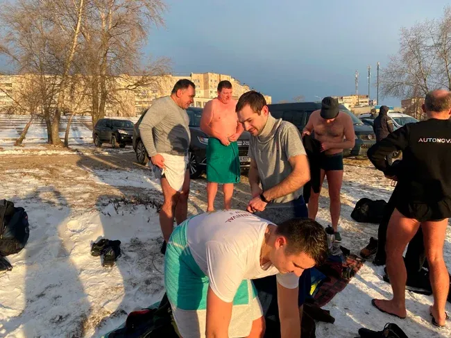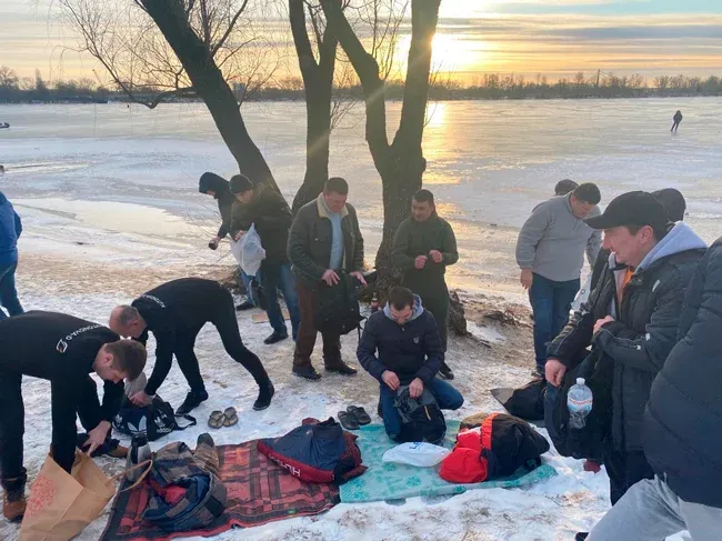 І перші підійшли до річки - у місці, де було зроблено прохід серед льоду, температура на вулиці -70 С.