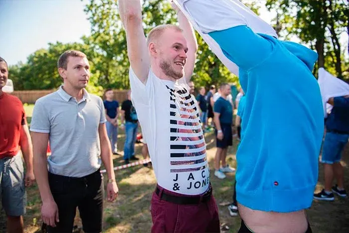 Перший конкурс для розігріву - перевдягання футболки. Футболку чіпати не можна, гравець, що стоїть за тобою, переодягає її на себе, і так по ланцюжку. Кажуть, на корпоративах люди зближуються. Так ось як це відбувається.