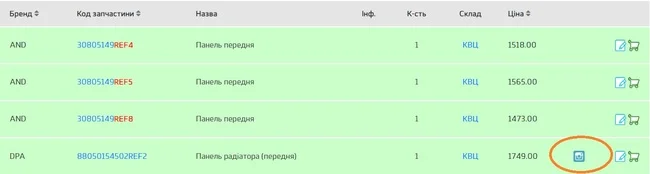«Пробиваємо» номер запчастини через пошукове вікно. Поруч з іконами «додати в кошик» та «додати в замітки» знаходимо новий значок з фотоапаратом.