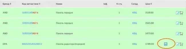«Пробиваємо» номер запчастини через пошукове вікно. Поруч з іконами «додати в кошик» та «додати в замітки» знаходимо новий значок з фотоапаратом.