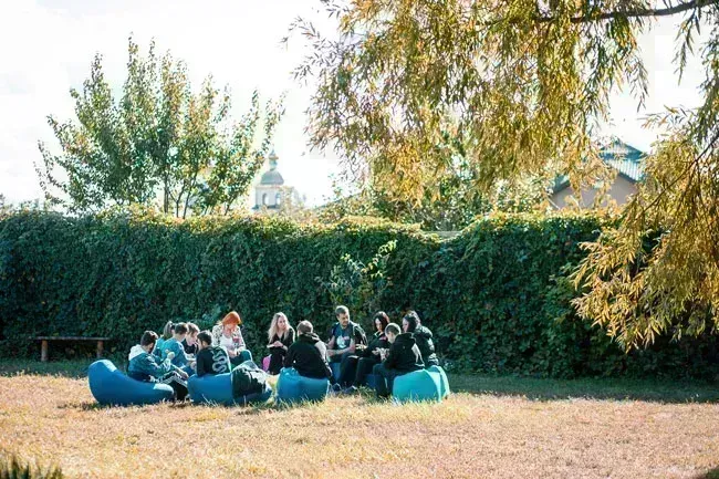 Немного подкрепившись, девушки уютно устроились на креслах-мешках, чтобы посплетничать, некоторые мужчины играли в волейбол, остальные коллеги общались и наслаждались прекрасными видами.