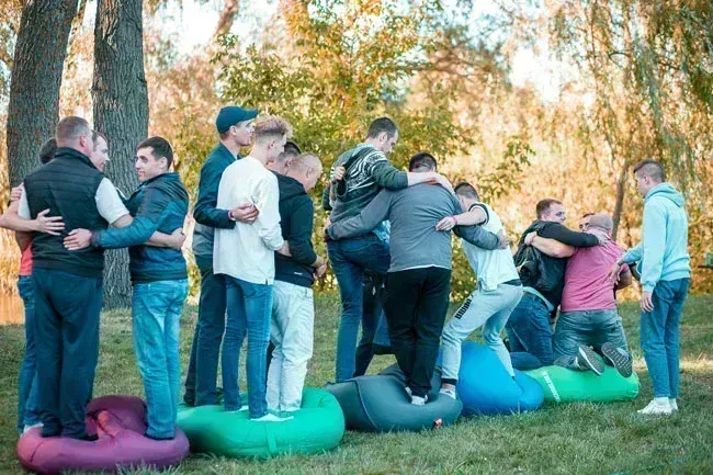 Следующее – Остров Невезенья. Нужно было с пуфа на пуф перейти на ту сторону, не касаясь ногами земли. Все бы ничего, если бы не по четыре человека на пуфах.